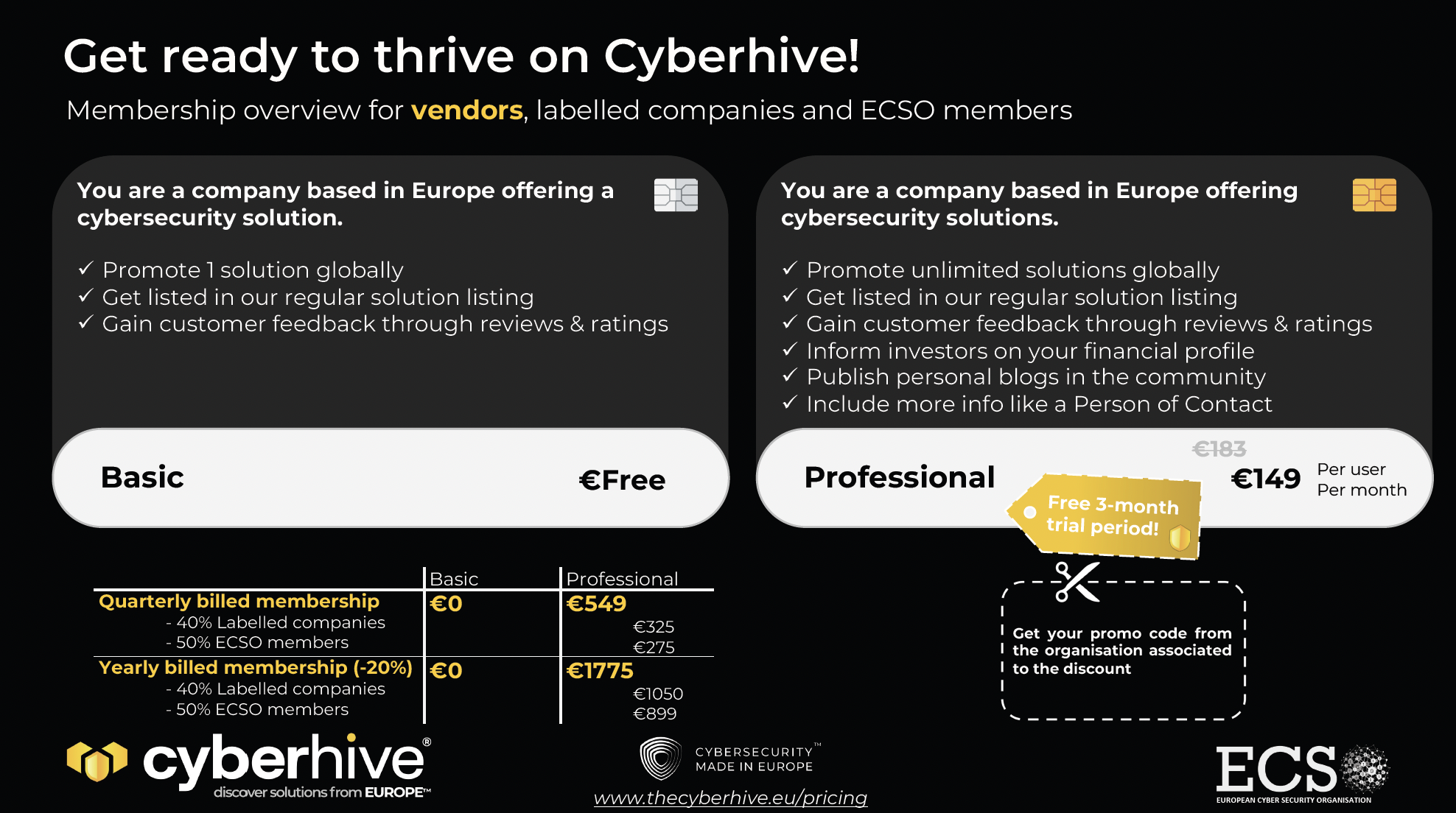 ECSO members get a 50% discount on all memberships, more on our pricing page here: www.thecyberhive.eu/pricing